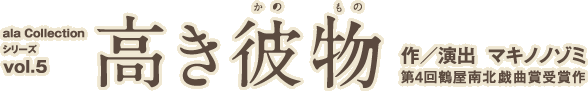 5作品目となる「高き彼物」は、静岡県の田舎町で起こった小さな事件をめぐって、信念をもって真っ直ぐに生きる元教師とその周囲の人々を丁寧に愛情こめて描いたマキノノゾミの最高傑作です。出演はかつて、つかこうへい事務所の舞台で活躍し、「世界の車窓から」のナレーションでもお馴染み石丸謙二郎、NHK連続小説「あぐり」鮮烈デビューをして現在も大活躍の田中美里、それに現代演劇に欠かせない名脇役の品川徹など。笑って、泣けるマキノ作品の真髄が盛り込まれた舞台を、実力派のキャストでお届けします。