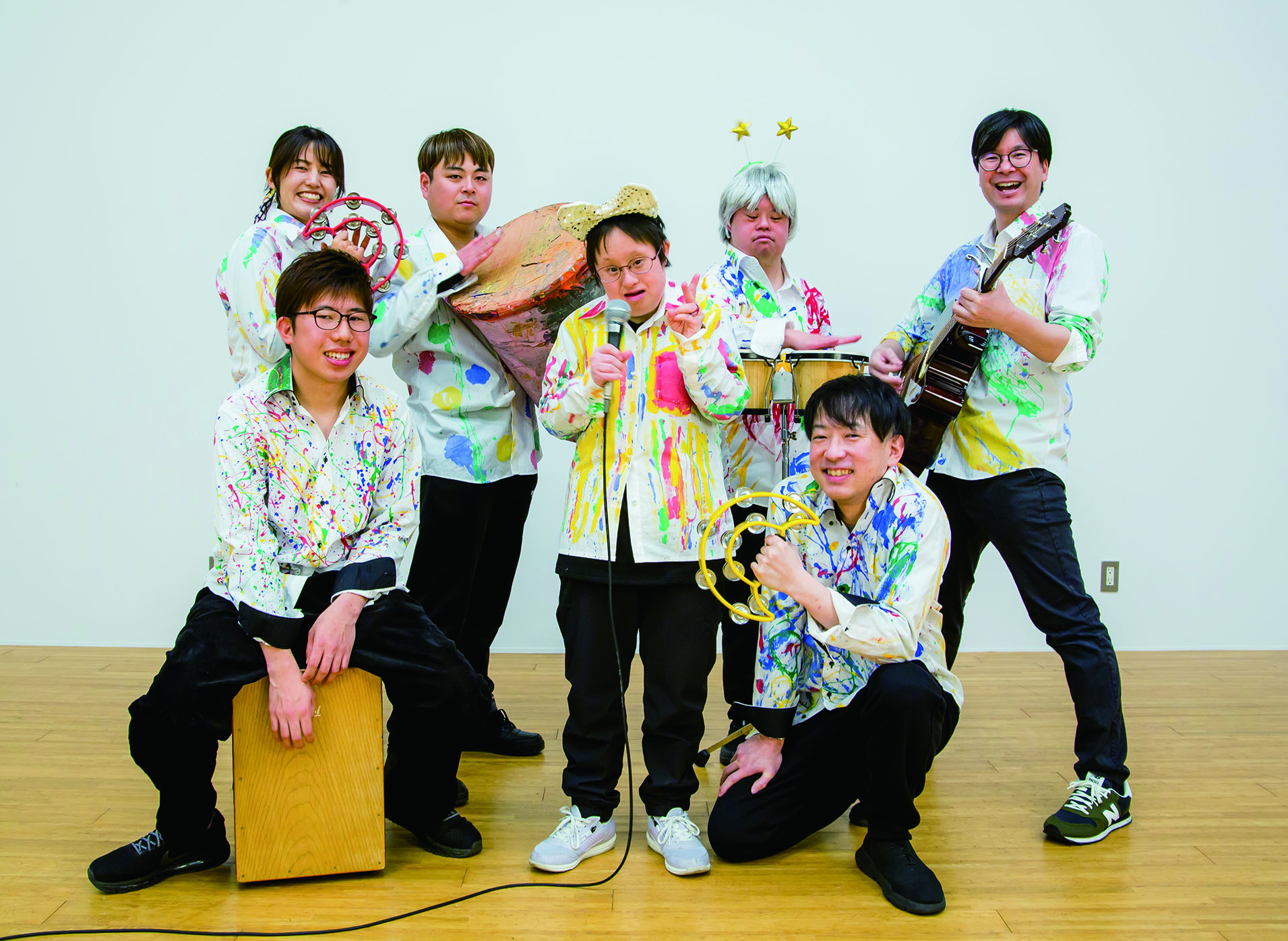 前列の右から:神戸俊栄(かんべちゃん)(担当:自由)、太田百香(ももちゃん)(担当:ボーカル)、香月伊織(いおりくん)(担当:カホン) 後列の右から:大野弦(げんさん)(担当:ギター)、藤井哲也(てっちゃん)(担当:ボンゴ・パフォーマー)、高木礁(タカショー)(担当:バケツドラム、パフォーマー)...