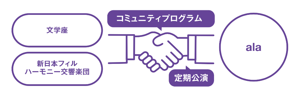 2008年度よりアーラは日本を代表する「文学座」と「新日本フィルハーモニー交響楽団」の2団体と地域拠点契約を結んでいます。アーラを拠点に、この2つの芸術団体が公演はもちろん、ワークショップや学校・福祉施設などに出向いたアウトリーチ活動などをプログラミングした包括的な提携契約です。質の高い様々な活動を地域の皆様に展開しています。この2団体に契約を依頼したのは、高水準な芸術性と多くの多様な人材を持っていること、そして決め手は、文学座は毎年400を超えるワークショップやアウトリーチをやっていること、新日本フィルは周知のように東京都墨田区と連携してコミュニティへのプログラムを日常業務として展開しているという経験と技術集積でした。