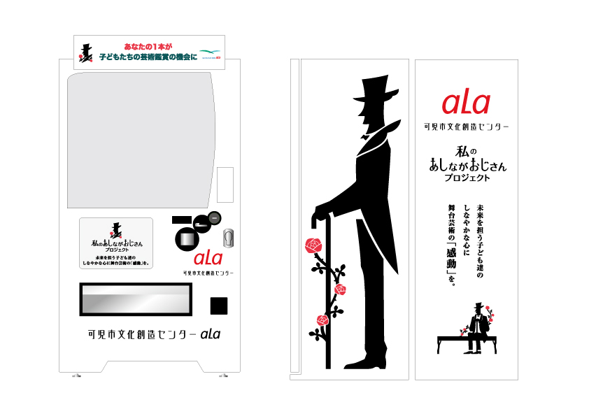 アーラ駐車場に清涼飲料水の自動販売機を設置しました。これはコカ・コーラ社との連携により、アーラの「私のあしながおじさんプロジェクト」をさらに進めるものです。プロジェクトは、子どもたちにアーラで開催される舞台芸術・イベントのチケットをプレゼントして、文化芸術に触れる機会をつくるものです。資金は企業や個人からの寄付により成り立っていますが、今回からさらに広く来場の皆さんのさりげなく温かい善意を期待して新しい取り組みを導入しました。自販機の売り上げの20%がアーラに寄付されることになります。その資金でこれまでのチケットプレゼントを続けますが、さらに学校でのコミュニケーション ワークショップや、不登校などの学校に行くことができない子どもたちや就学前の子ども・その保護者のワークショップなど、これからアーラが始めようとする子どもの笑顔のためのさまざまな事業に活かしていきます。