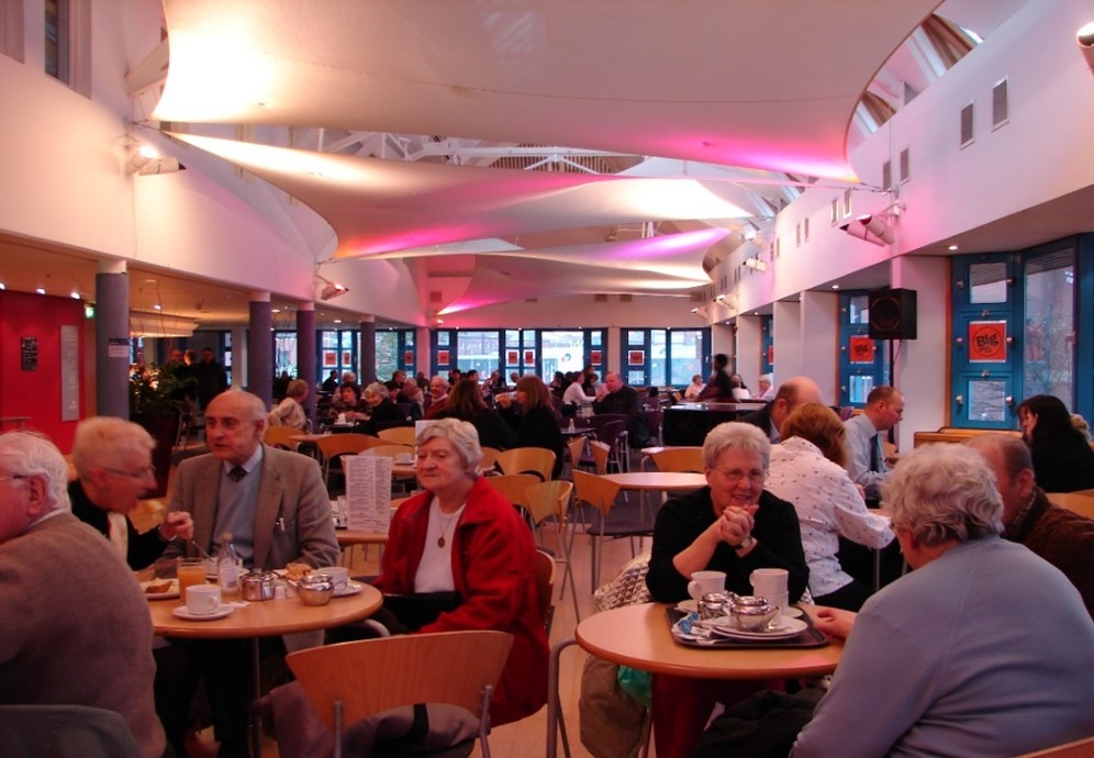 WYPの立地をリーズ大学構内からクオリーヒルズの現在地に建設する際、その設計プロセスには、現場の劇場人が強い権限を持って関わったと聞いています。のちにロンドンのサウスバンクセンターの芸術監督となるWYP初代芸術監督ジュード・ケリーも開場後のプログラム展開を構想しながら、様々な設計案を出したのではないかと想像します。再開発によって全英展開する百貨店チェーンJohn Lewisの巨大な建物が出来たことで人の流れが大きく変化して、リーズプレイハウス(旧ウエストヨークシャ・プレイハウス)の入り口は、改装後の現在では再開発で建設された巨大百貨店John Lewis側の大通りに面したところに移っていますが、当時のWYPの入り口は、クオリーヒルズに上がる石階段を上がったところにあって、入るとまず目に飛び込んでくるのがレストラン&バーのある巨大な空間です。ここでは「Heydays」の様々なプログラムが大勢の高齢者によって行われますし、またスタッフの打ち合わせ、ランチ時の市民の食事のレストラン、私のような外来のゲストとの懇談等々と多様な用途に常時開放されています。入り口を入って数段の階段を上がると、扉の一切ない、その大きな空間となります。劇場に入るためのステージドア(楽屋口)は階下のリハーサル室の傍に設けられているのですが、開場以来堅く封印がされています。したがって、キャストも技術スタッフも芸術監督・経営監督をはじめとする劇場幹部職員も、そして多くの市民たちも、すべてこの広い空間を通って劇場内部に入って行くことになります。このスペースの配置と用途と役割が、ジュード・ケリーの劇場理念を物語るものと私は思っています。この仕掛けは、人々が分け隔てなくコミュニケーションの機会を得て、「つながり」という価値が生まれる場として、あえて扉を排した設計になっていると感じました。日本では劇場建設計画には、どのような劇場理念を体現するために今後展開する事業の構想を持っている現場の人間が関わることはほとんどありません。それだけに、北海道劇場計画に参画できた足掛け7年間は、真駒内の道庁の休眠施設をマネジメントとマーケティングを中心に劇場経営の専門家育成機関を設けて、乱立して休眠化している全国の文化施設に派遣する計画を立案するとか、高度利用地区の札幌駅中央口前が立地予定地だったために相当にゆったりとしたプロアスペースがとれるので、障がい者施設と協働でパンを焼ける匂いが常にする大きなレストランスペースのある劇場を構想したり、広いレストランスペースであることから調理場もそれに比例して大きくしなければならないわけで、そこで高齢者世帯向けに廉価な食事を宅配する機能を設けようと、北海道劇場発信の社会的存在意義経営の発想は拡がるばかりでした。