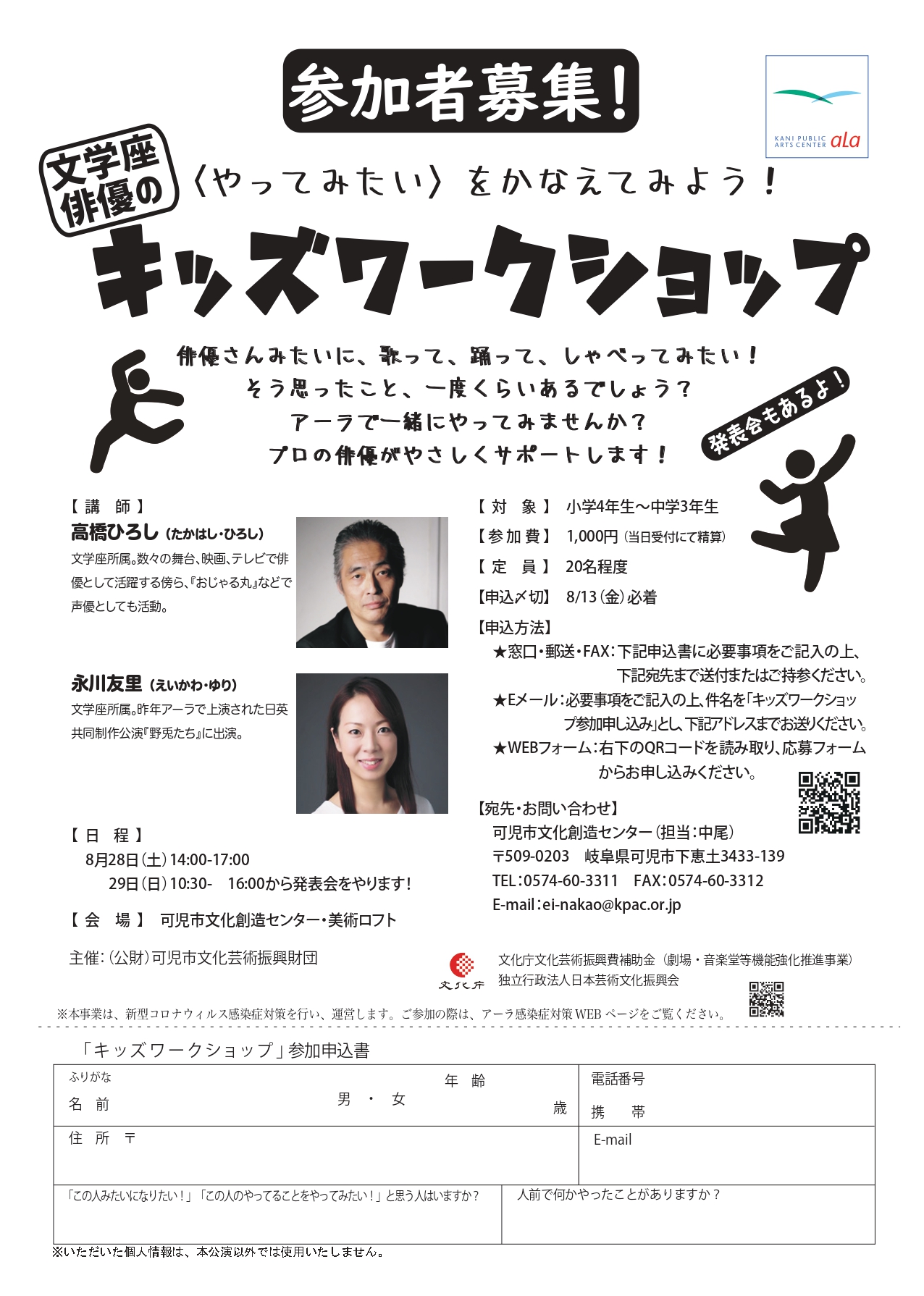 ・Eメール:必要事項を記入の上、件名「キッズワークショップ参加申し込み」としお送りください。