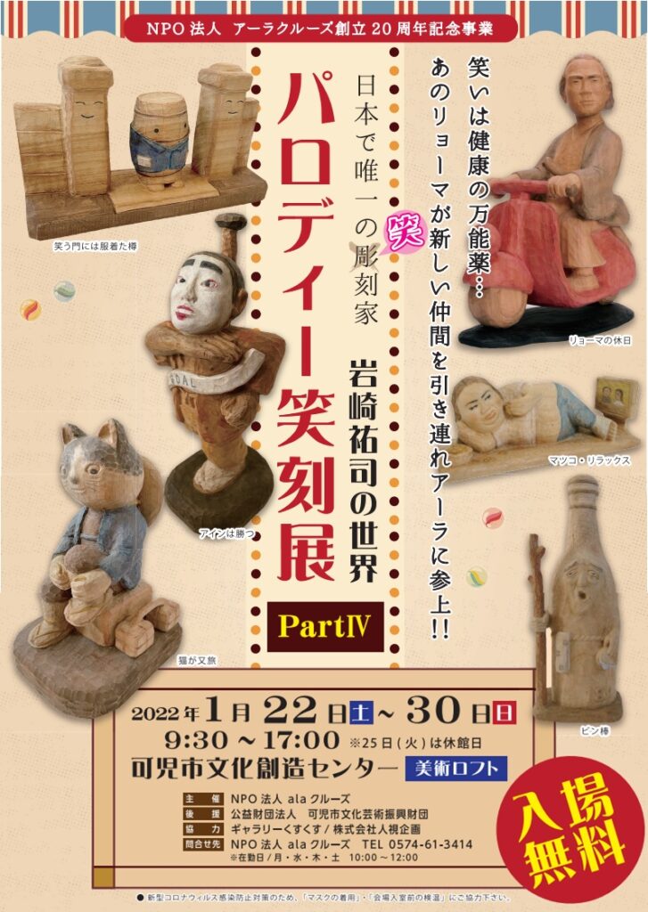 NPO法人alaクルーズは、今年度創立20年を迎えました。これもひとえに皆様方のご支援の賜物と感謝し厚く御礼申し上げます。岩崎祐司の笑刻展第4回目を企画いたしました。多くの皆様にご来場頂くようお願い申し上げます。