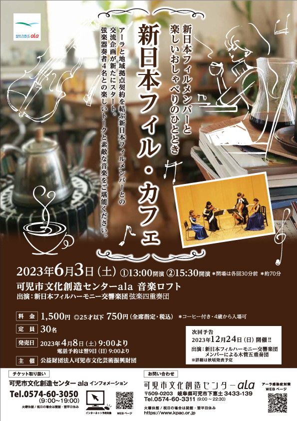 アーラと地域拠点契約を結ぶ新日本フィルハーモニー交響楽団との交流企画が新たにスタート。おいしいコーヒーを飲みながら、弦楽奏者の4名との楽しいトークと素敵な音楽をご堪能ください。