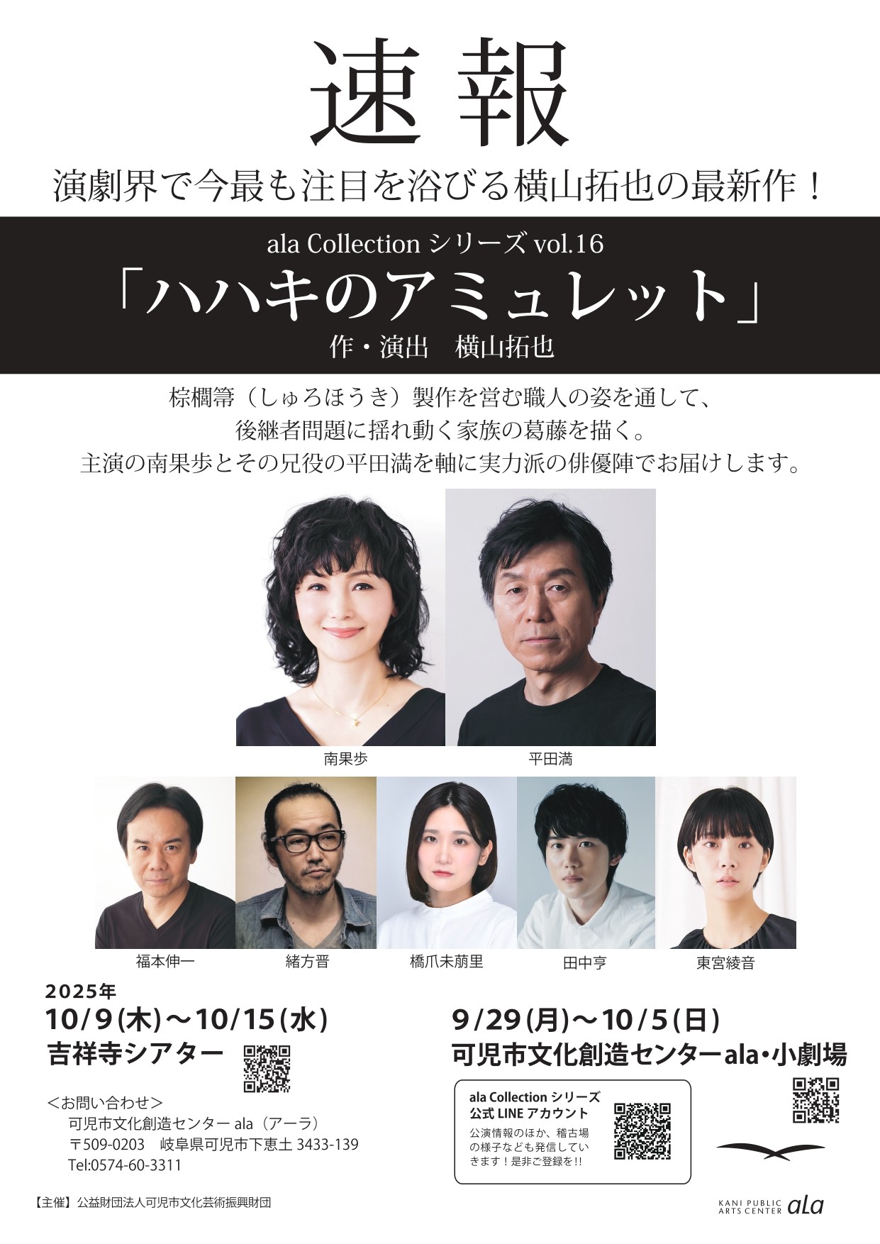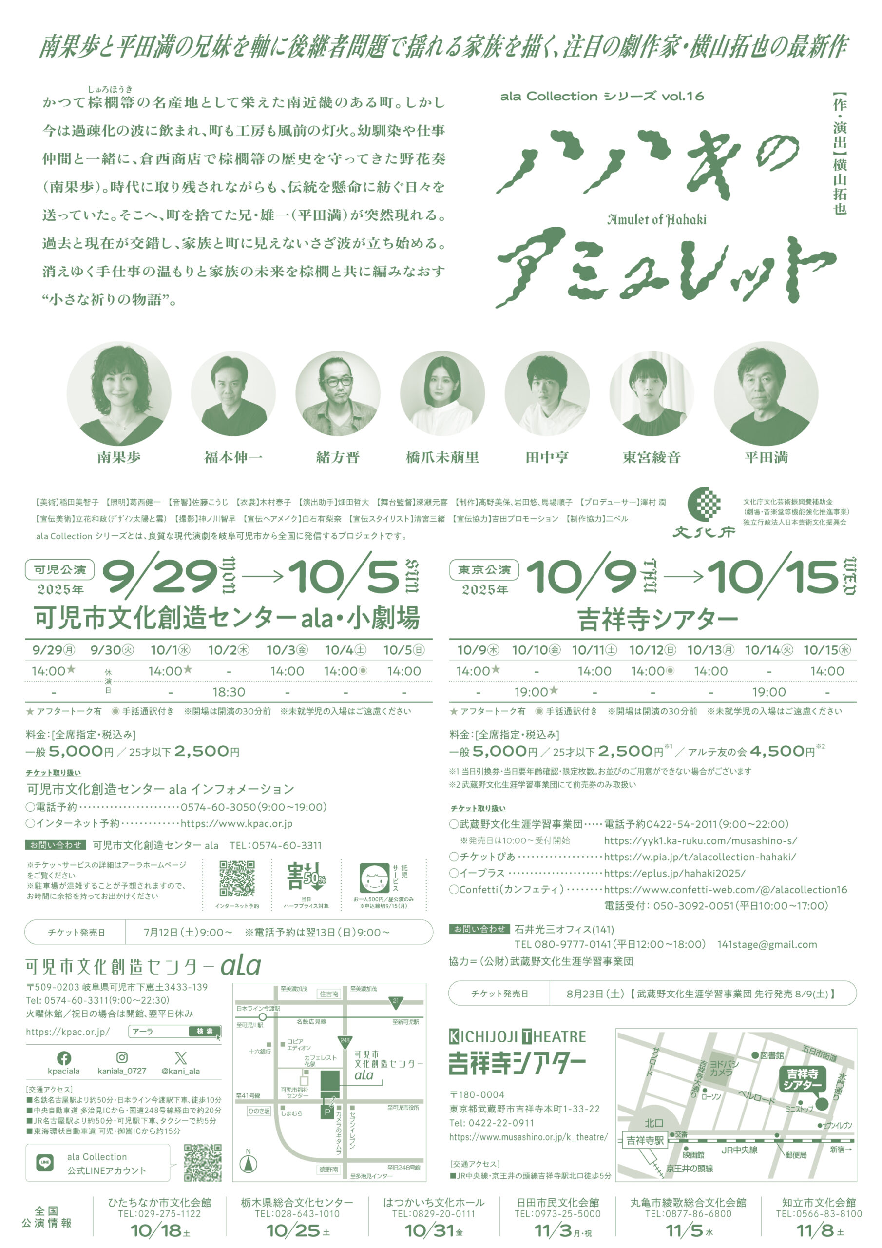 第59回紀伊國屋演劇賞個人賞受賞の横山拓也の書下ろし。棕櫚箒(しゅろほうき)製作を営む職人の姿を通して後継者問題で揺れ動く家族の葛藤を炙り出す。主演の南果歩とその兄役の平田満を軸に実力派の俳優陣でお届けします。
