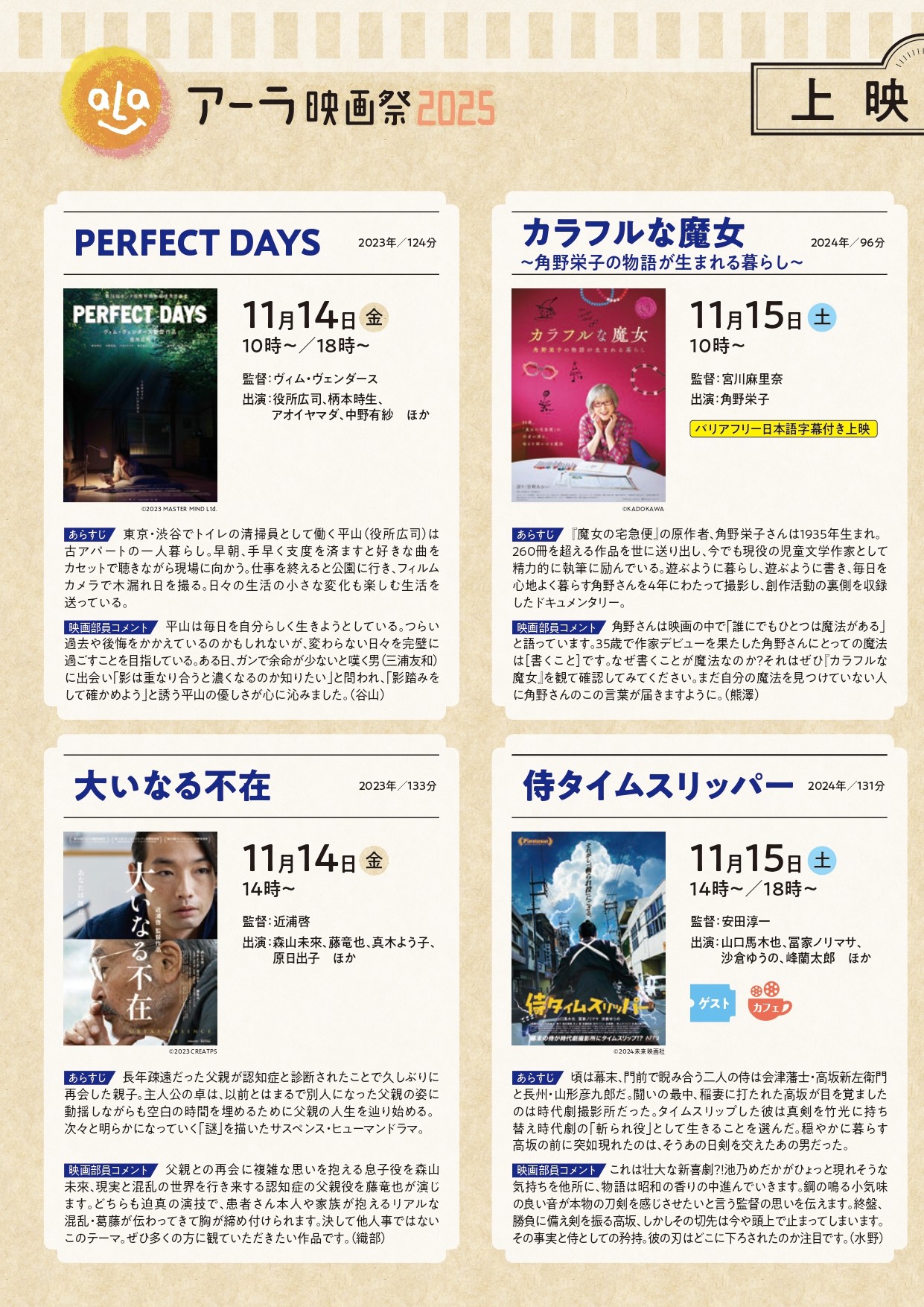 今年もアーラ映画部(旧:アーラ映画祭実行委員会)が厳選したおススメ作品を上映します!