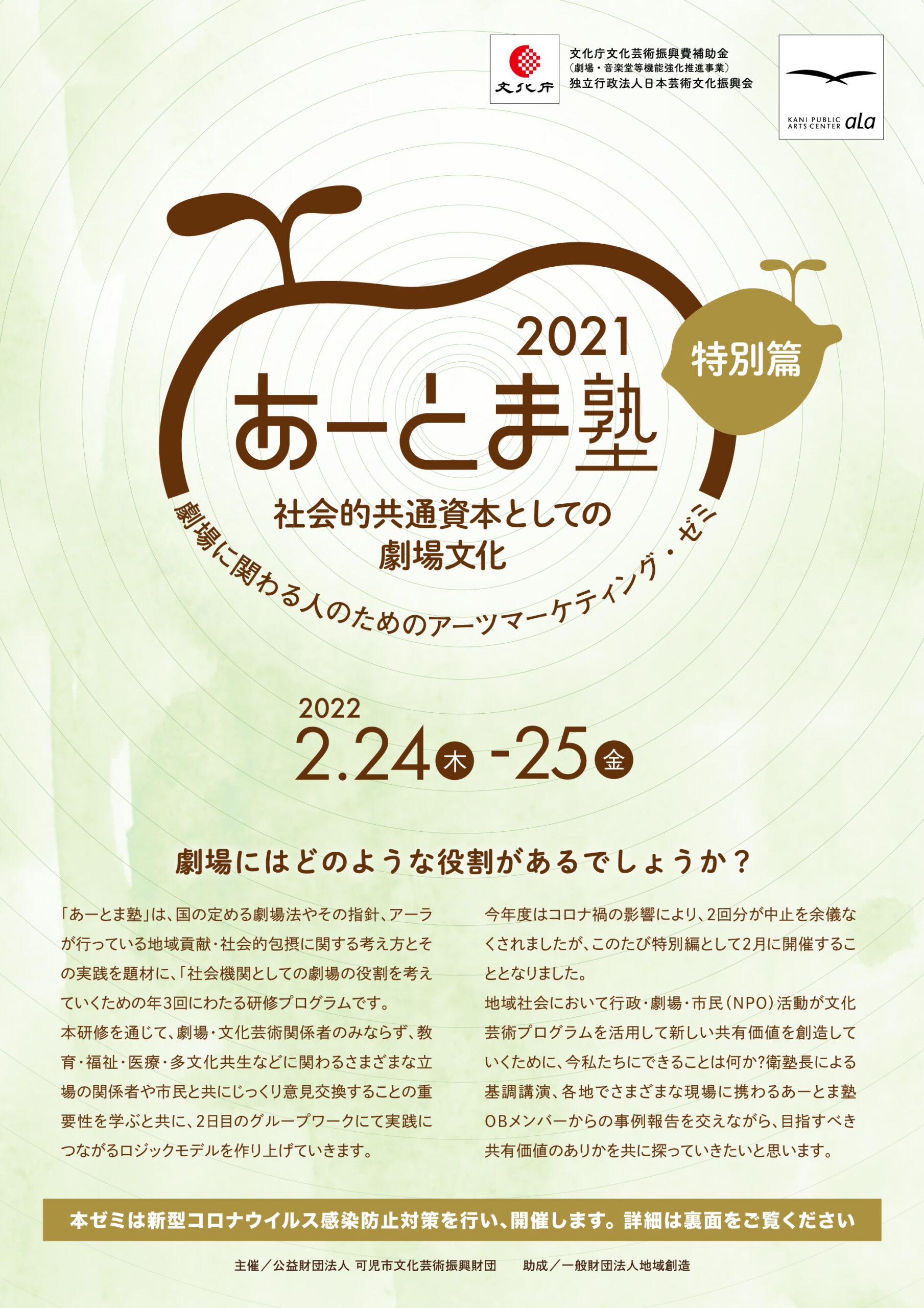 「あーとま塾」は、国の定める劇場法やその指針、アーラが行っている地域貢献・社会的包摂に関する考え方とその実践を題材に、「社会機関としての劇場の役割」を考えていくための年3回にわたる研修プログラムです。
