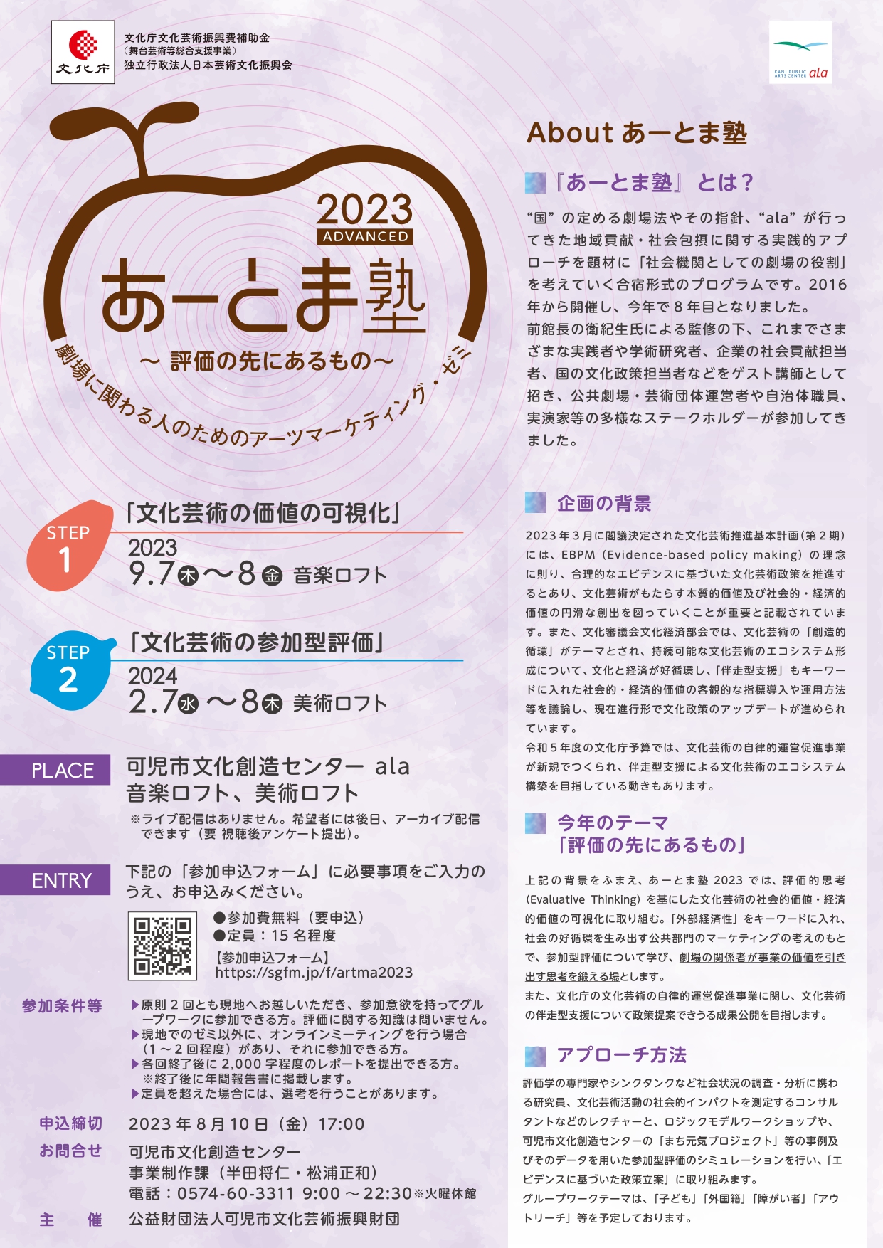 「あーとま塾」は、”国”の定める劇場法やその指針、”ala”が行ってきた地域貢献・社会的包摂に関する実践的アプローチを題材に、「社会機関としての劇場の役割」を考えていく合宿形式のプログラムです。評価学の専門家やシンクタンクなど社会状況の調査・分析に携わる研究員、文化芸術活動の社会的インパクトを測定するコンサルタントなどのレクチャーと、ロジックモデルワークショップや、可児市文化創造センターの「まち元気プロジェクト」等の事例及びそのデータを用いた参加型評価のシミュレーションを行い、「エビデンスに基づいた政策立案」に取り組みます。