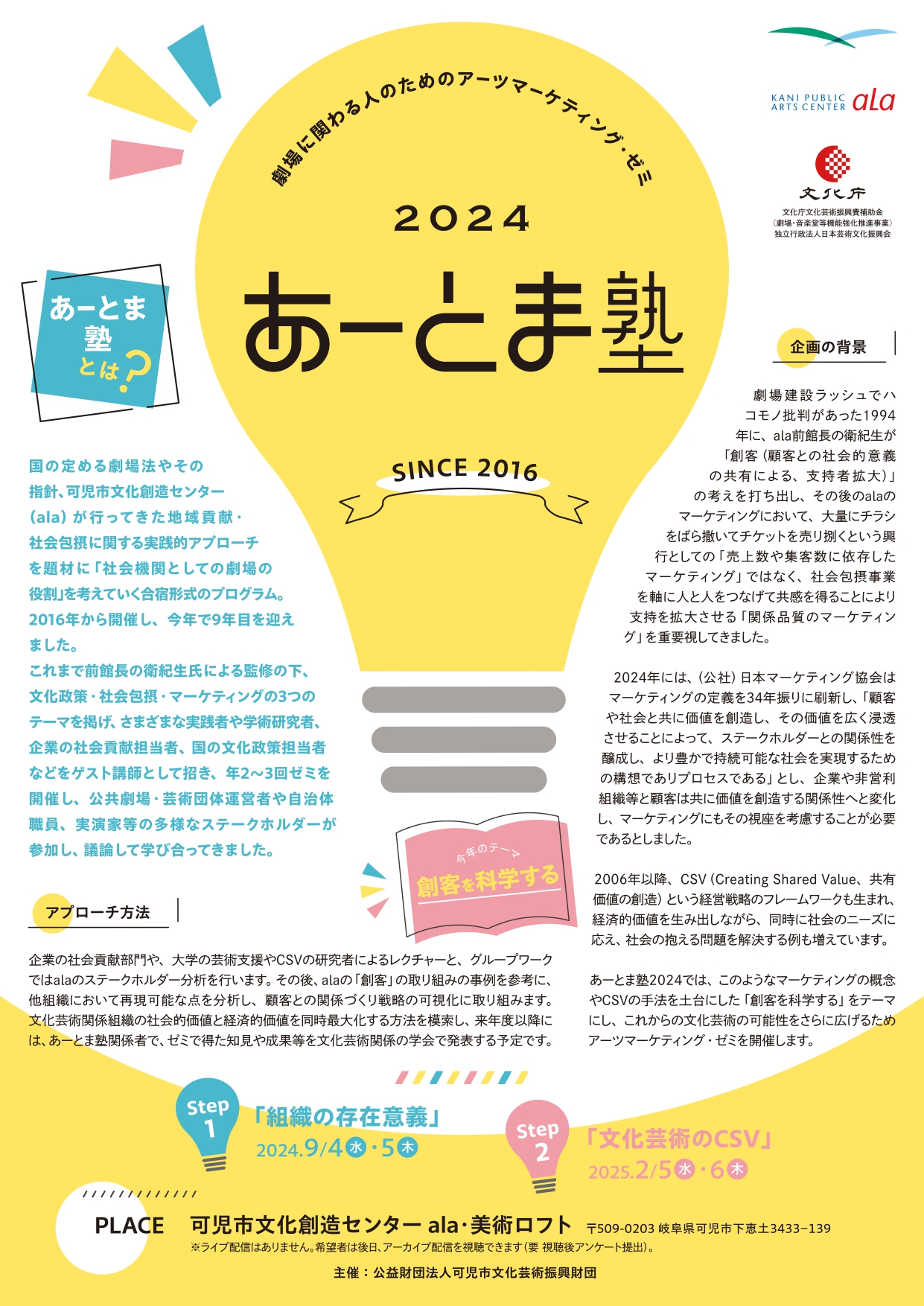 「あーとま塾」とは、国の定める劇場法やその指針、可児市文化創造センター(ala)が行ってきた地域貢献・社会包摂に関する実践的アプローチを題材に「社会機関としての劇場の役割」を考えていく合宿形式のプログラムです。今年は、企業の社会貢献部門や、大学の芸術支援やCSVの研究者によるレクチャーと、グループワークではalaのステークホルダー分析を行います。その後、alaの「創客」の取り組みの事例を参考に、他組織において再現可能な点を分析し、顧客との関係づくり戦略の可視化に取り組みます。文化芸術関係組織の社会的価値と経済的価値を同時最大化する方法を模索し、来年度以降には、あーとま塾関係者で、ゼミ得た知見や成果等を文化芸術関係の学会で発表する予定です。