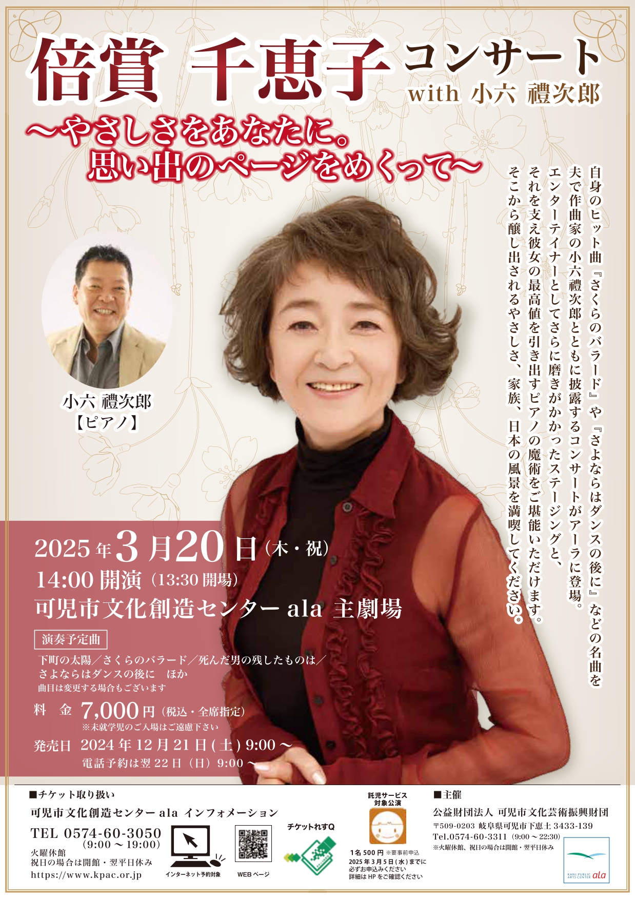 自身のヒット曲『さくらのバラード』や『さよならはダンスの後に』などの名曲を夫で作曲家の小六禮次郎とともに披露するコンサートがアーラに登場。