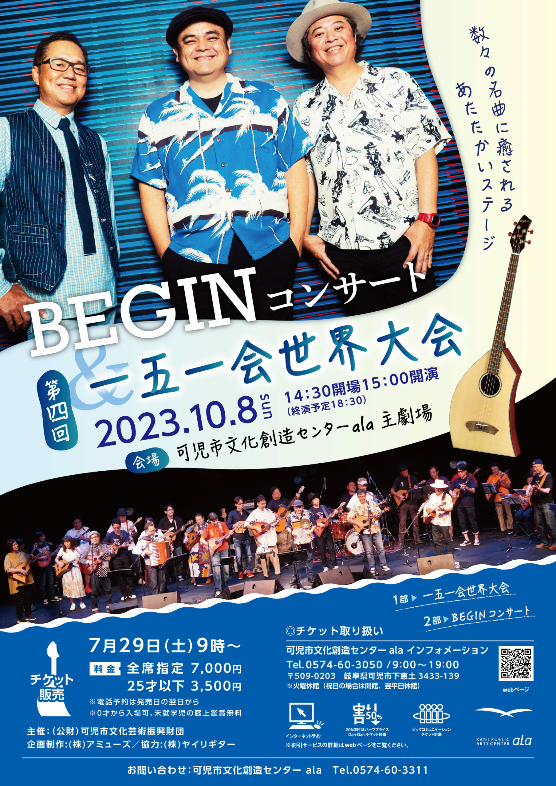 昨年に引き続きBEGINがアーラに登場!誰もが知る名曲から最新曲まで、心があたたかくなるステージをお楽しみください。BEGINと可児市のギターメイカー「ヤイリギター」が共同開発した楽器"一五一会"の世界大会との2部構成で開催します。