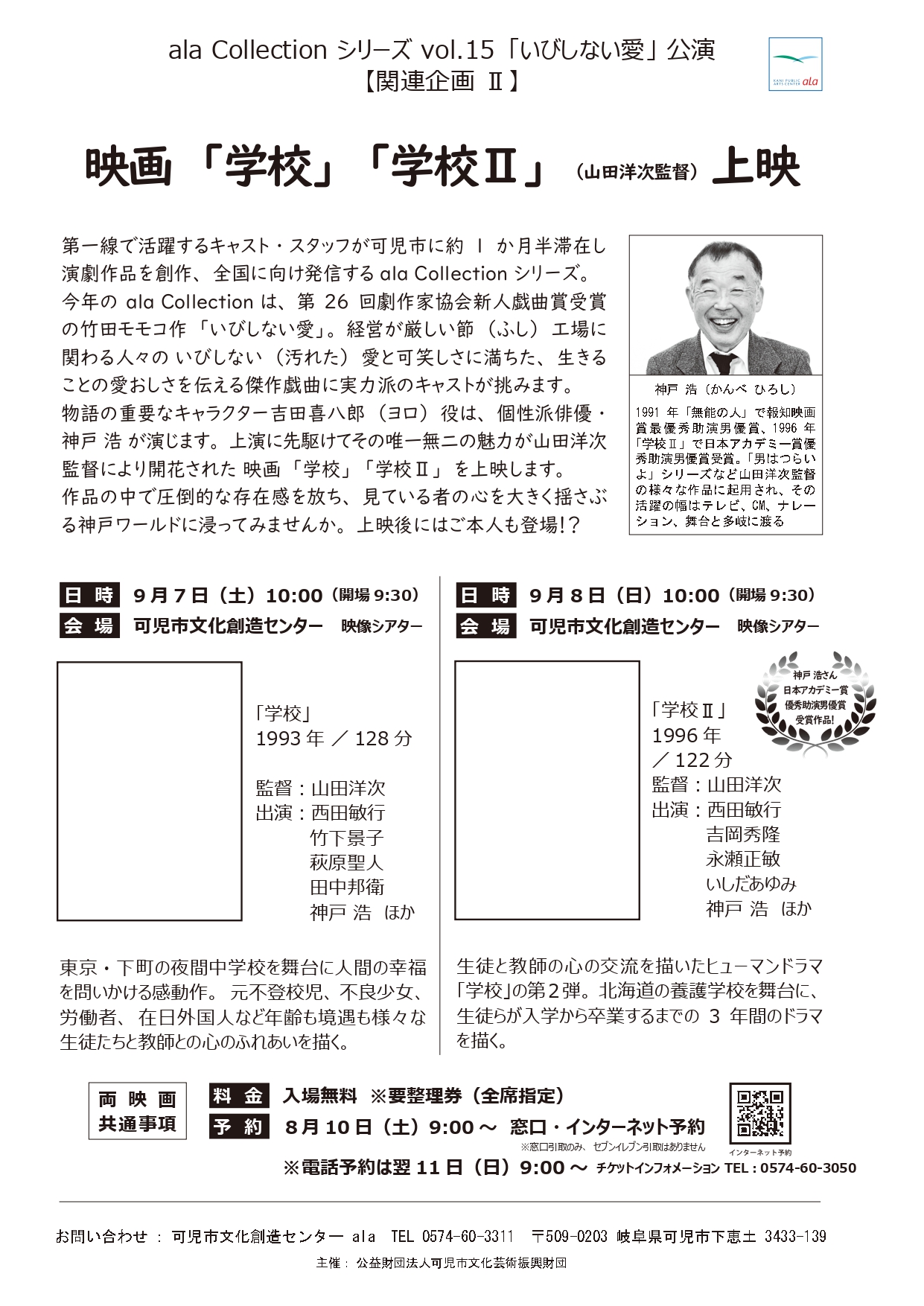 物語の重要なキャラクター吉田喜八郎 (ヨロ) 役は、 個性派俳優 ・神戸 浩 が演じます。 上演に先駆けてその唯一無二の魅力が山田洋次監督により開花された 映画 「学校」 「学校Ⅱ」 を上映します。作品の中で圧倒的な存在感を放ち、 見ている者の心を大きく揺さぶる神戸ワールドに浸ってみませんか。 上映後にはご本人も登場!?