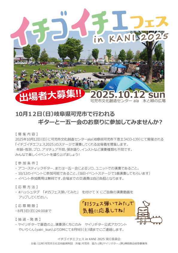 可児市のギターメーカーヤイリギターとBEGINの共同開発によって生まれた和楽器「一五一会」の演奏家が集う「一五一会世界大会」を昨年度まで主劇場で開催してきました。今年からより地域に根付くお祭りのようなイベントになることを目指し、屋外で一五一会に限らず、ギターも含めて音楽と楽器体験が楽しめるイベントとして開催します。