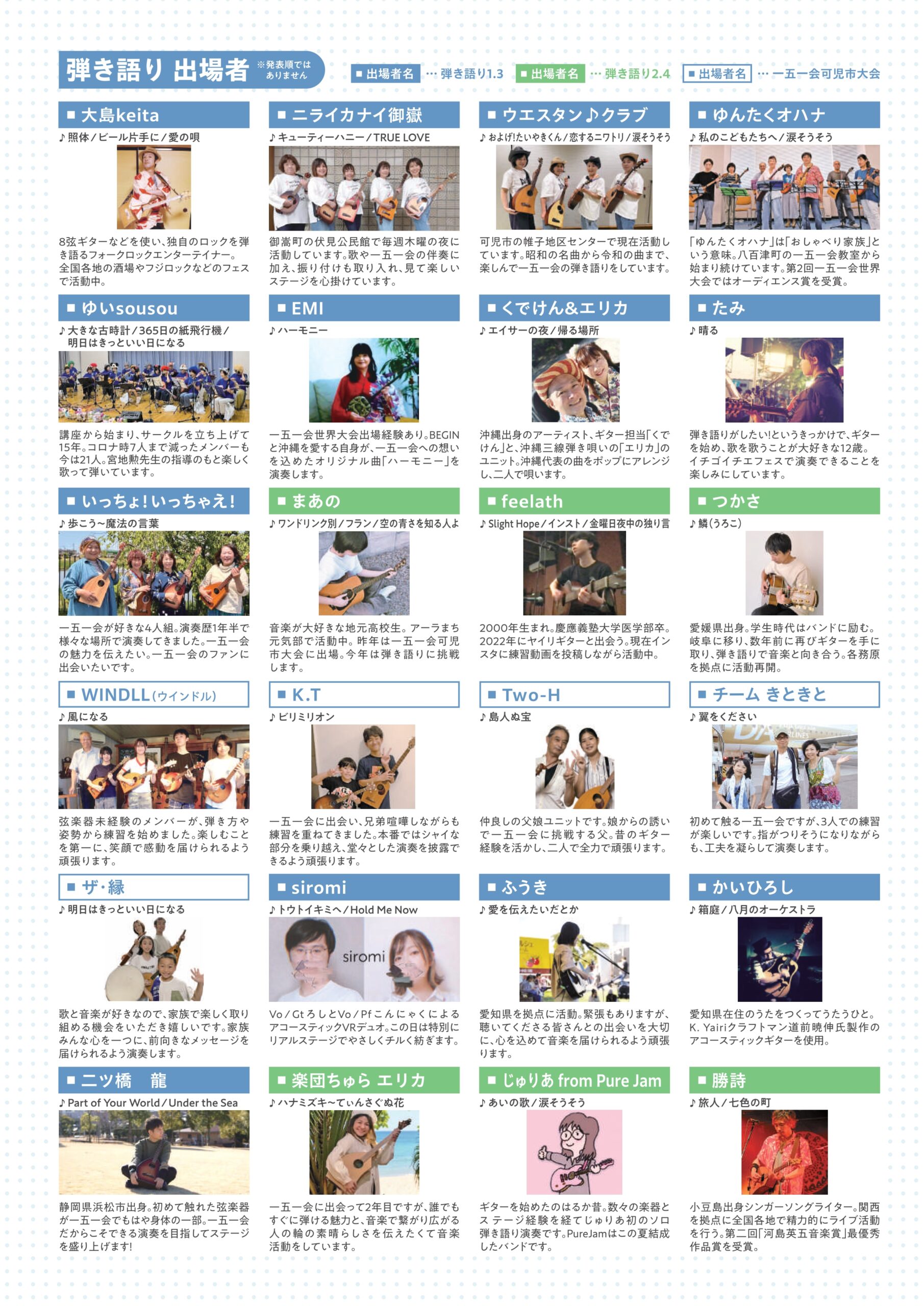 大島keita、ニライカナイ御嶽、ウエスタン♪クラブ、ゆんたくオハナ、ゆいsousou、EMI、くでけん&エリカ、たみ、いっちょ!いっちゃえ!