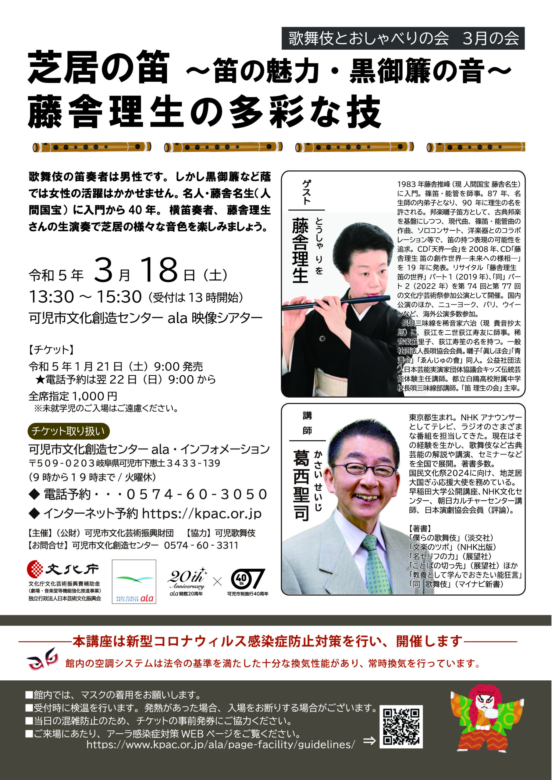 黒御簾音楽 ー笛の魅力に迫る 歌舞伎の笛奏者は男性です。しかし黒御簾など蔭では女性の活躍はかかせません。名人・藤舎名生(人間国宝)に入門から40年。横笛奏者、藤舎理生さんの生演奏で芝居の様々な音色を楽しみましょう。