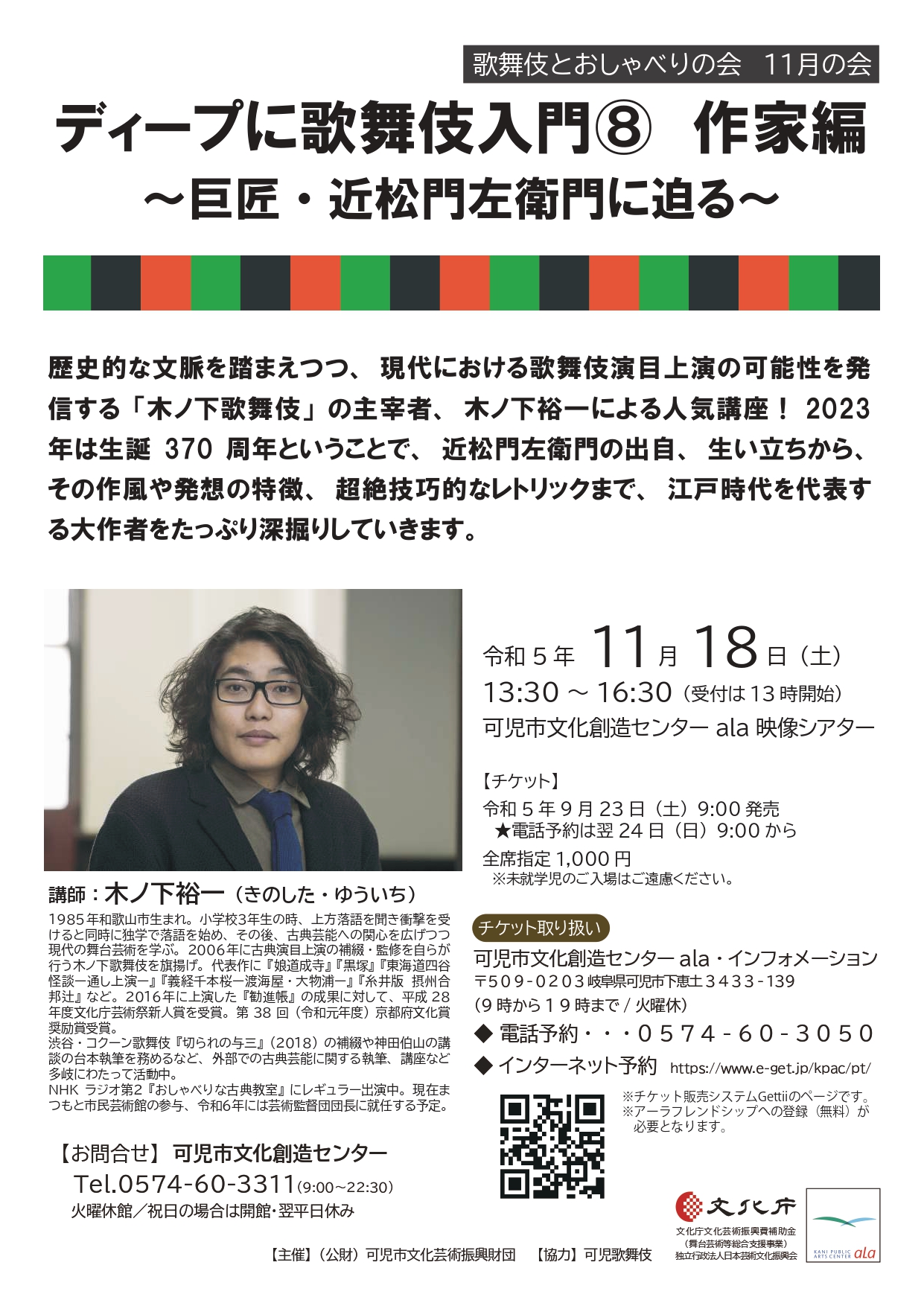 歴史的な文脈を踏まえつつ、現代における歌舞伎演目上演の可能性を発信する「木ノ下歌舞伎」の主宰者、木ノ下裕一による人気講座!2023年は生誕370周年ということで、近松門左衛門の出自、生い立ちから、その作風や発想の特徴、超絶技巧的なレトリックまで、江戸時代を代表する大作者をたっぷり深掘りしていきます。
