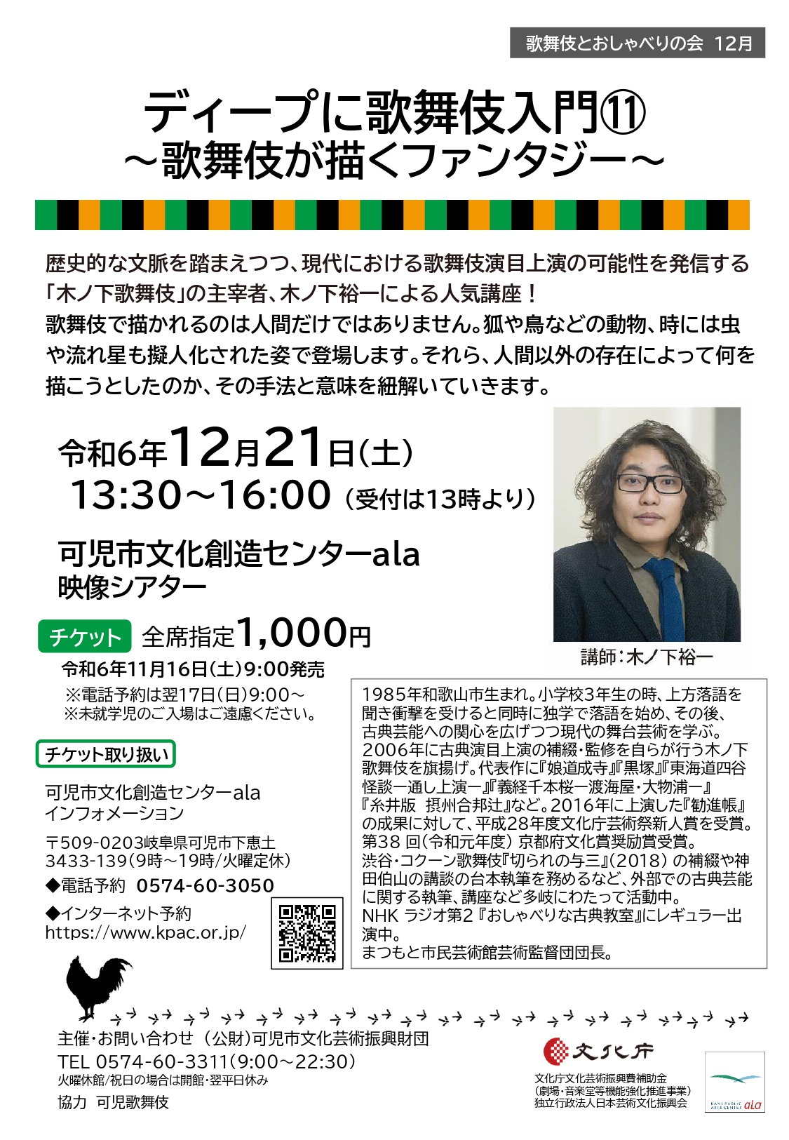 歴史的な文脈を踏まえつつ、現代における歌舞伎演目上演の可能性を発信する「木ノ下歌舞伎」の主宰者、木ノ下裕一による人気講座! 歌舞伎で描かれるのは人間だけではありません。狐や鳥などの動物、時には虫や流れ星も擬人化された姿で登場します。それら、人間以外の存在によって何を描こうとしたのか、その手法と意味を紐解いていきます。