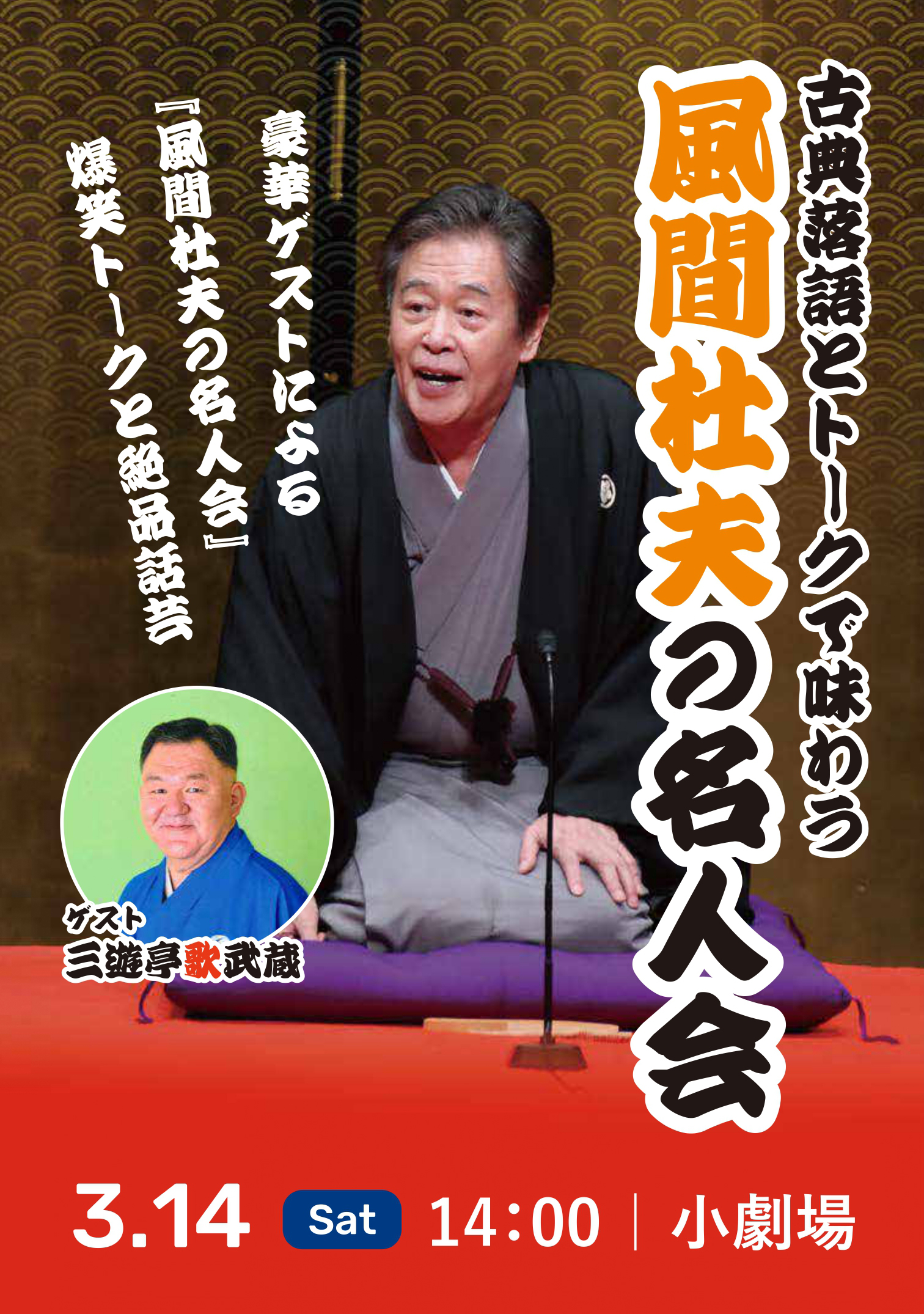 毎年恒例「風間杜夫の名人会」。 今年度は、落語界随一の大型ゲストが登場!元力士という異色の経歴を持つ、岐阜県出身の噺家・三遊亭歌武蔵師匠!巨躯から繰り出される話芸の数々は、まさに一撃必笑。今年、注目の大一番です!