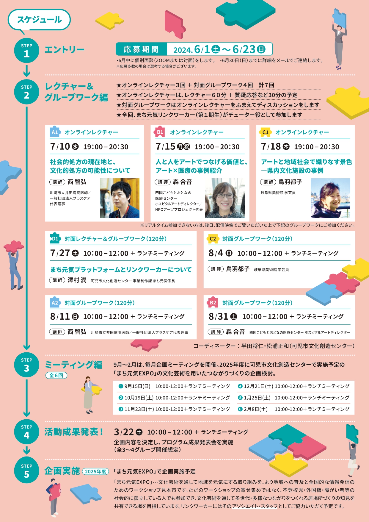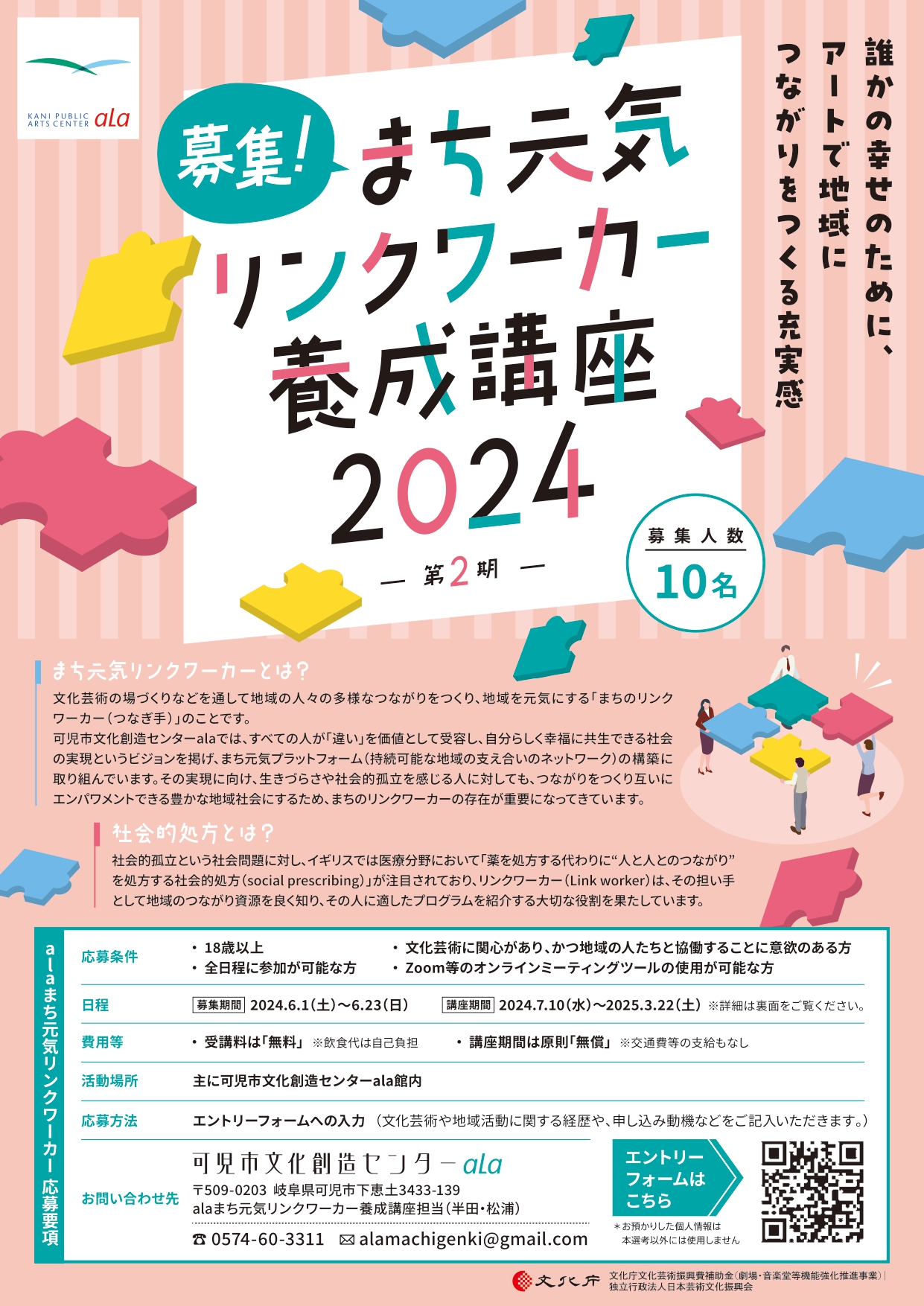 文化芸術の場づくりなどを通して地域の人々の多様なつながりをつくり、地域を元気にする「まちのリンクワーカー(つなぎ手)」。人と人、人と事をつないで地域に新しい価値をつくることに喜びを感じる方の応募をお待ちしております! スケジュールはチラシをご覧ください。