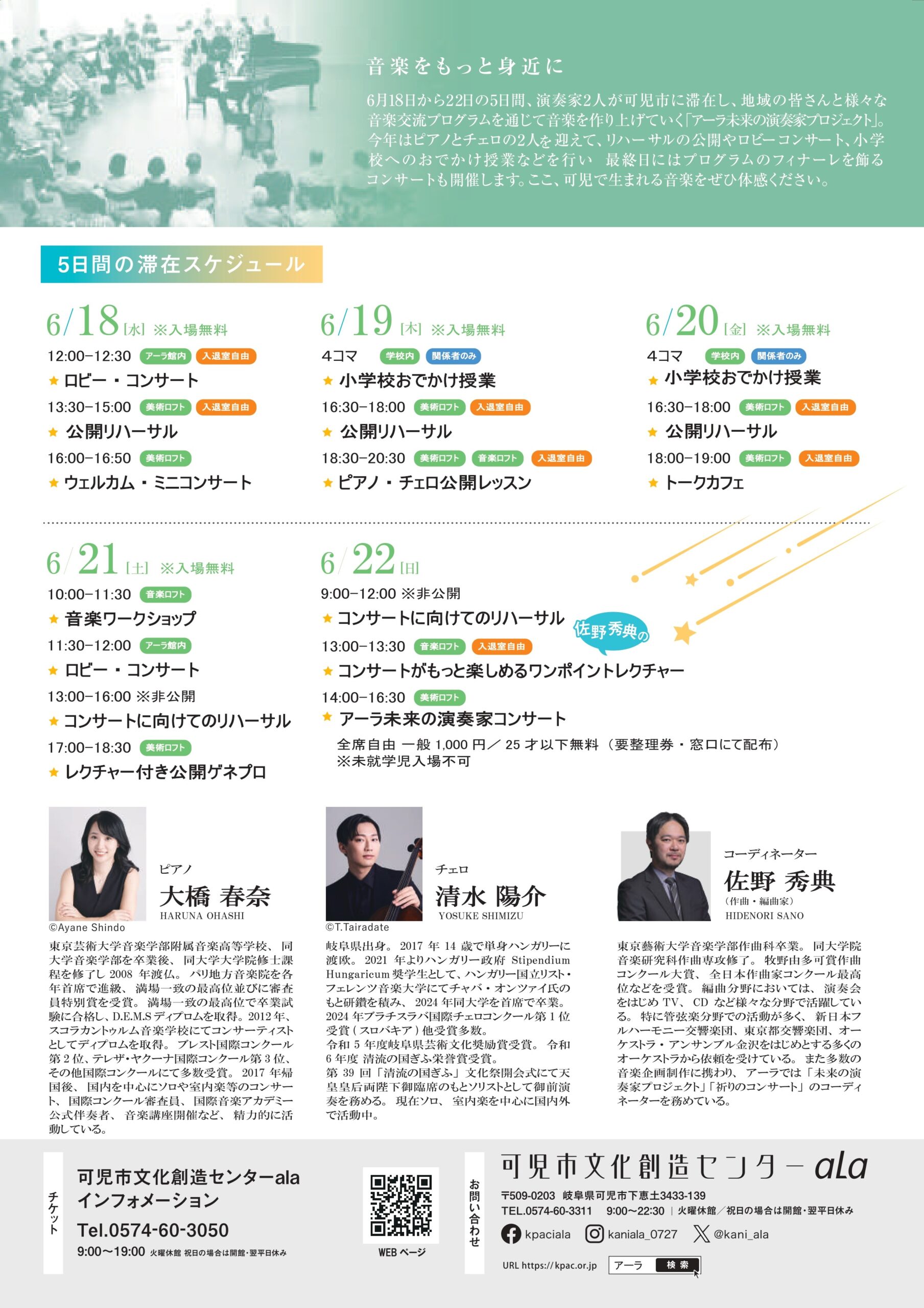 演奏家が可児に滞在して、市民の皆さんと音楽的交流を重ねながら音楽を作り上げていく「アーラ未来の演奏家プロジェクト」。6月にピアニスト大橋春奈とチェリスト清水陽介の2人を迎えて、公開リハーサルやロビーでの演奏、小学校へのおでかけ授業を行います。最終日にはフィナーレとなるコンサートも開催いたします。