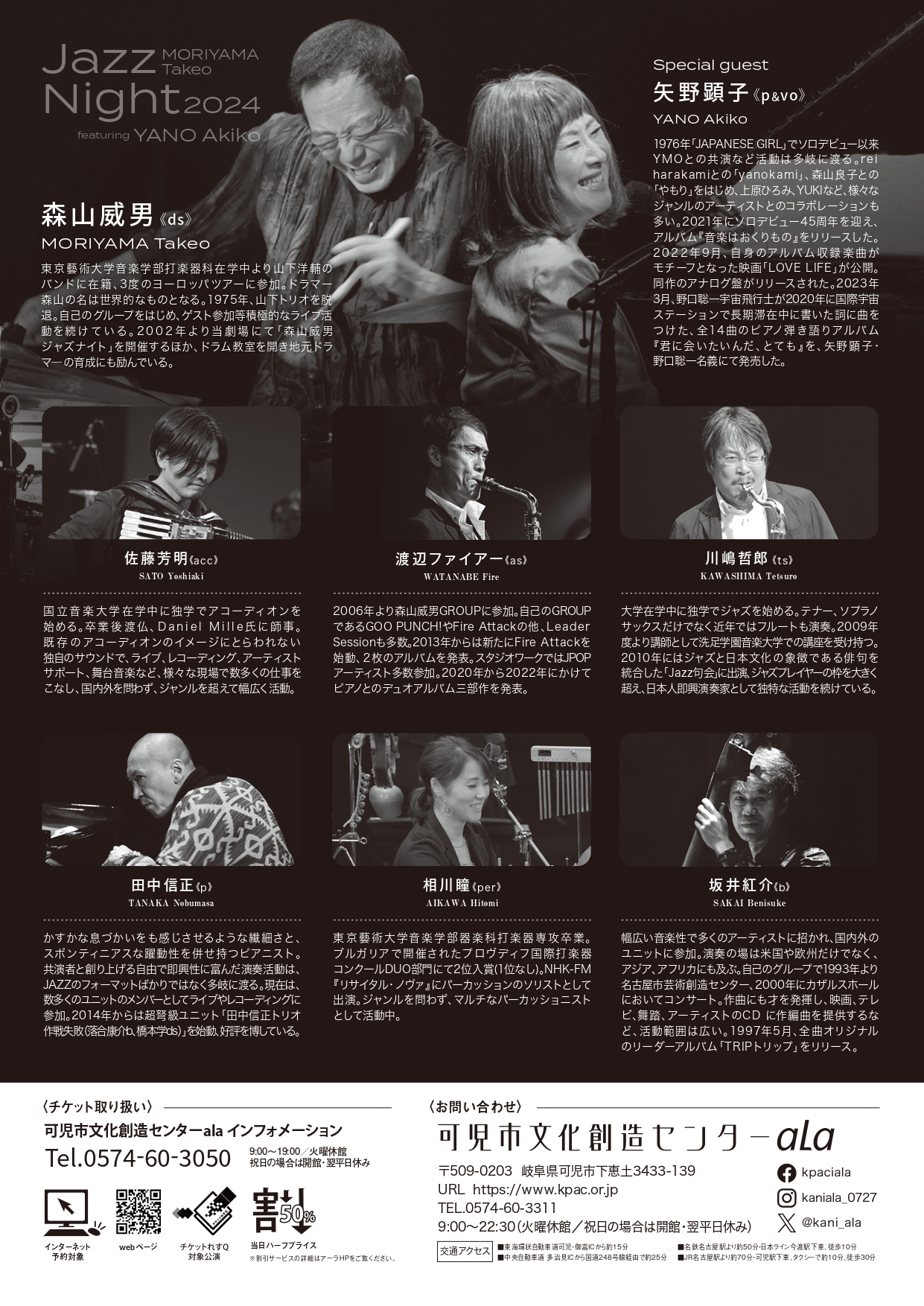 【出演】森山威男(ds)、【special guest】矢野顕子(p&vo)渡辺ファイアー(as)、川嶋哲郎(ts)、佐藤芳明(acc)相川瞳(per)、田中信正(p)、坂井紅介(b)