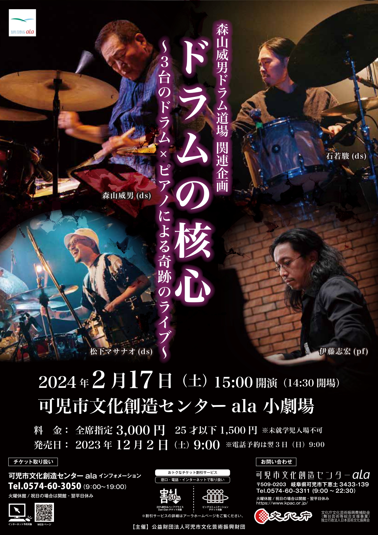 可児市在住の世界的ドラマー・森山威男と2人のドラマー、ピアニストが繰り広げる渾身のライブ。