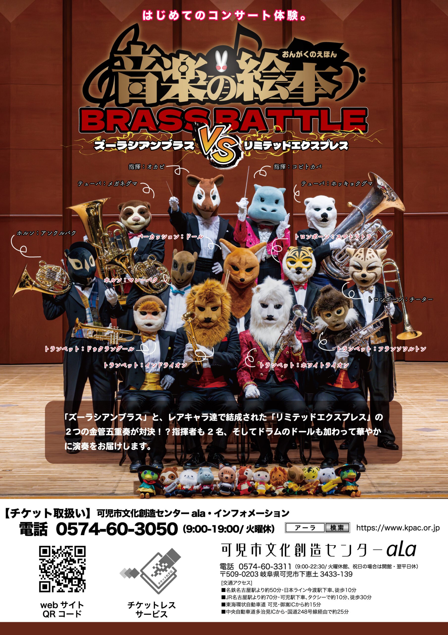 今年はまさかの音楽大合戦!!「ズーラシアンブラス」と、レアキャラ達で結成された「リミテッドエクスプレス」の2つの金管五重奏が対決!?指揮者も2名、そしてドラムのドールも加わって華やかに演奏をお届けします。