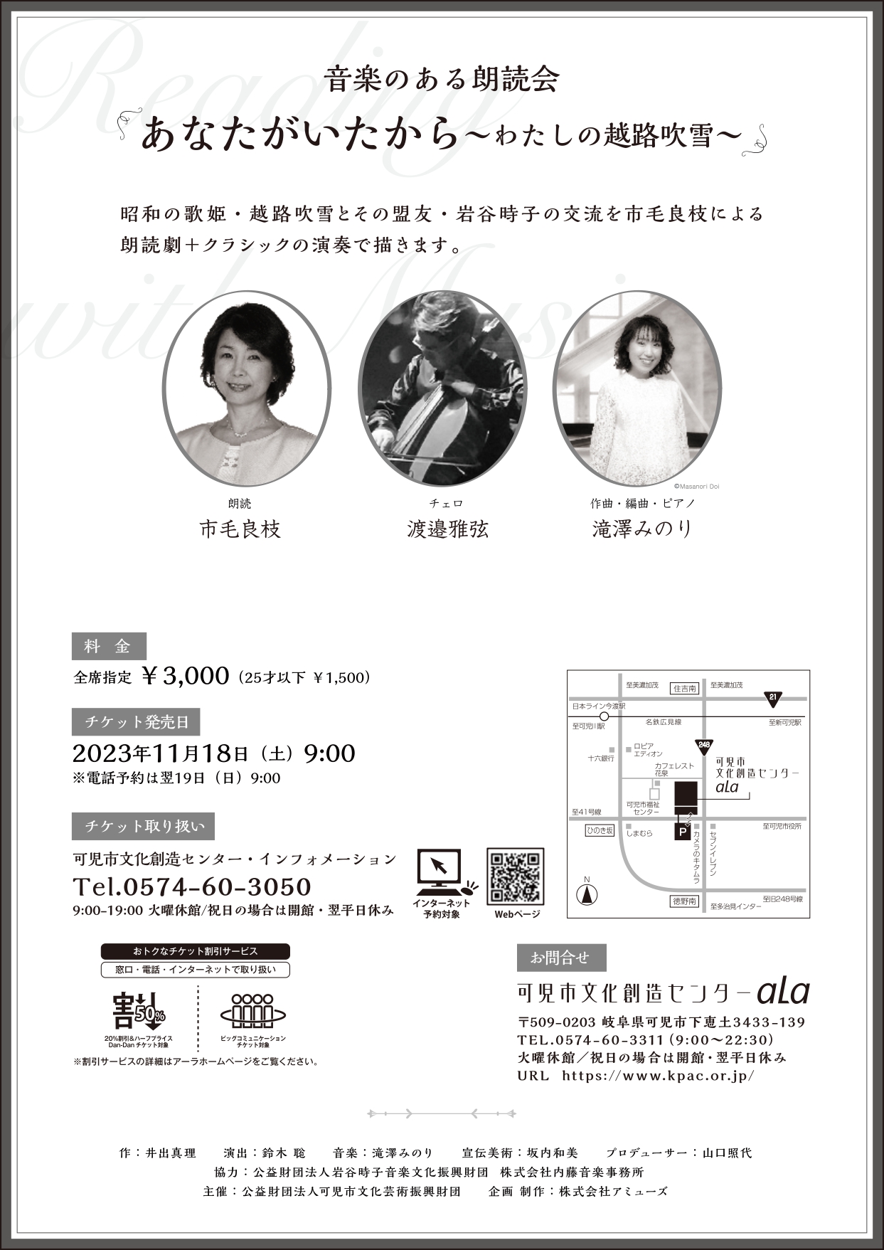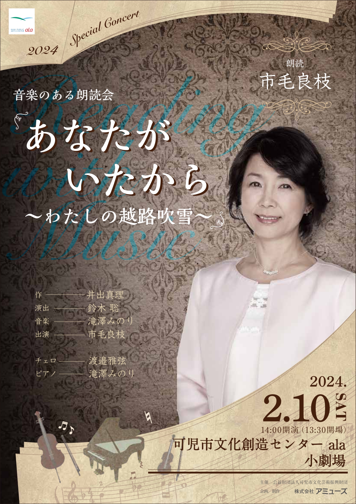 昭和の歌姫・越路吹雪とその盟友・岩谷時子の交流を市毛良枝による朗読劇+クラシック音楽編成の素敵な演奏で描きます。