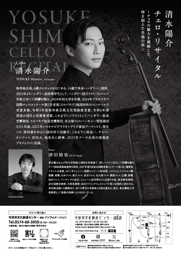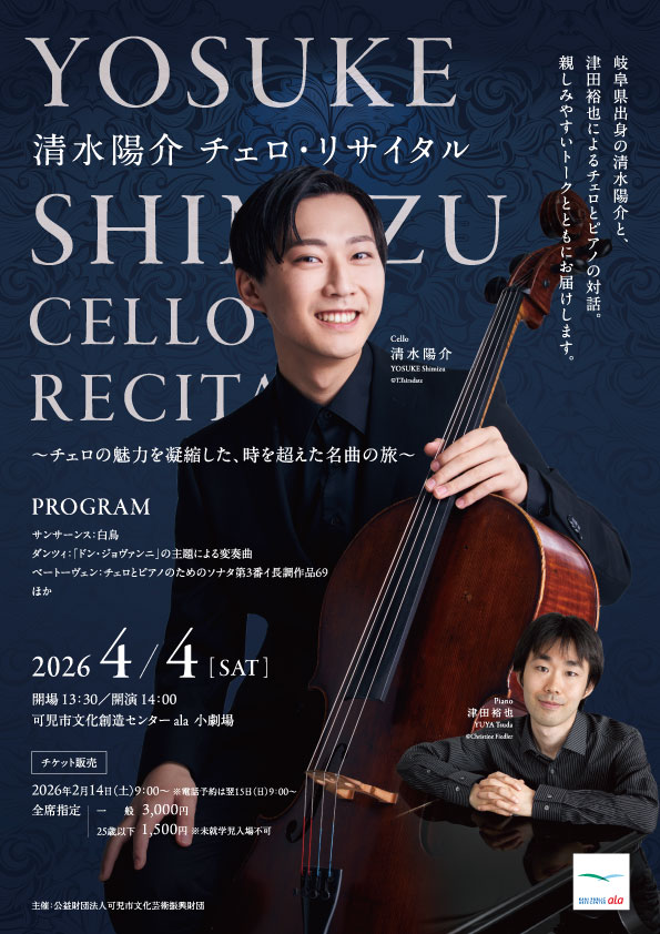 2025年度、アーラ未来の演奏家プロジェクトに参加した岐阜県出身の清水陽介と、津田裕也によるチェロとピアノの対話。親しみやすいトークとともにお届けします。