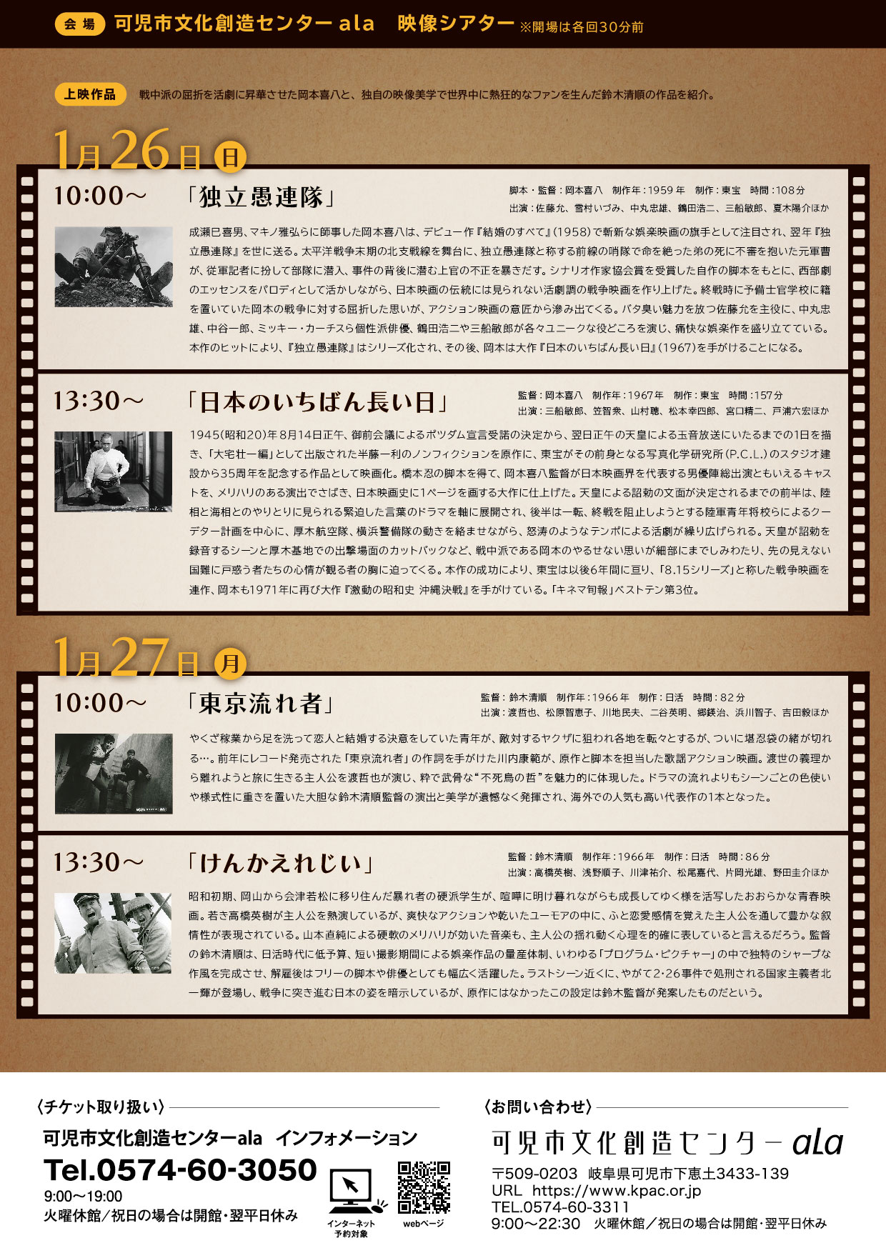戦中派の屈折を活劇に昇華させた岡本喜⼋と独⾃の映像美学で世界中に熱狂的なファンを⽣んだ鈴⽊清順の作品を紹介。