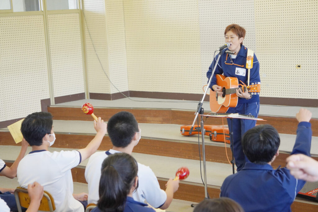 あつさんはライブを通して自分自身のエピソードを交えながら生徒たちにとって大切な「自分らしさ」「周りの人を大切にすること」「アイディアと行動」という3つのメッセージを力強く伝えてくれました。