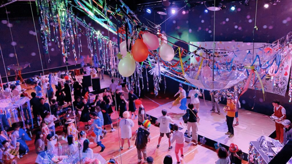 今回は「七夕」をテーマに、会場の天井に天の川をモチーフにしたキラキラした美術装飾と、入口には笹と短冊を飾り付けをして、七夕らしい季節感を演出。また新企画として、今回はみんなのディスコの中で「ファッションショー」も開催しました。となりの部屋でフェイスペイントやヘアメイク、仮装グッズを着込んだ後、ダンスフロアで踊り、ショーではその衣装でランウェイを歩き、みんなの注目を浴びました。