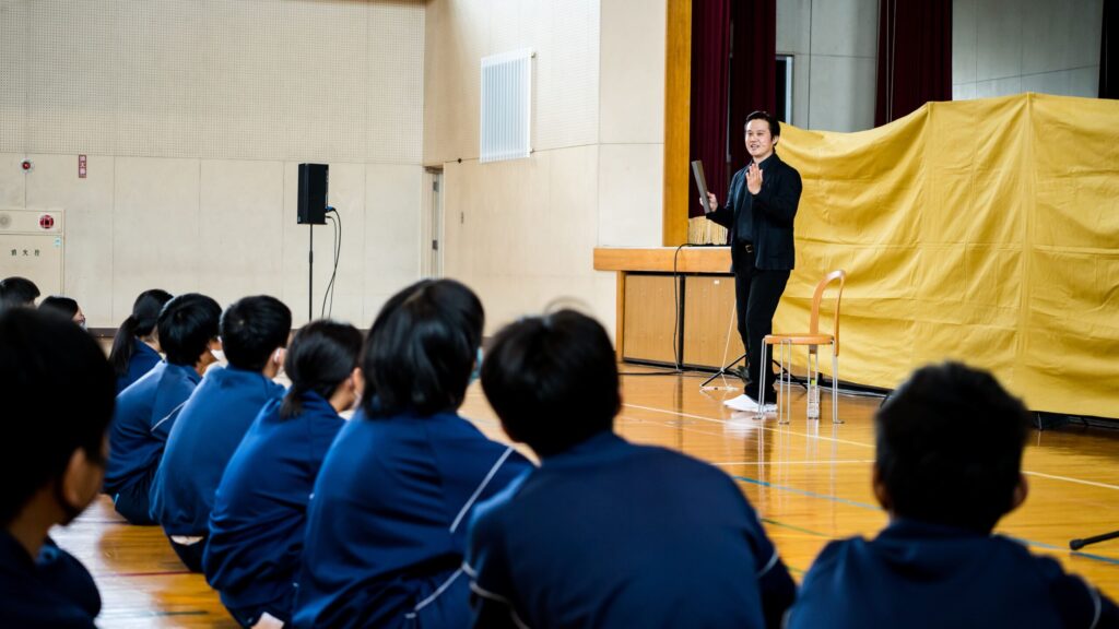 今年の朗読作品は、太宰治の『走れメロス』。生徒にとって身近な作品を読んで欲しいという先生からの要望があり、聴き手となる中学2年生の国語の教科書に掲載されているこの作品に決まりました。いきなり「メロスは激怒した」で始まる熱い感情が迸るこの作品を朗読してくれたのは、文学座の佐川和正さん。力強く響き渡る佐川さんの声に、生徒たちは作品の世界にグッと引き込まれている様子でした。朗読終了後の質問コーナーでは、初めて生で、間近で触れた、プロの俳優の本気の読みに、驚き、魅了され、興味を持った子どもたちから「どうやったらそんな声が出せるんですか?」「演じ分けがスゴイ!」「これまで聴いた朗読とは全然違いました!」「かっこよかったです!」などなど、俳優さんへの質問や感想をたくさんいただきました。また、先生からは「教室で教科書の朗読CDを聴かせている時とは、生徒の表情が全く違った。正直、こんなに集中して聴いてくれるとは思っていなかった」という感想もいただきました。先生にとっても、子どもたちの新たな一面と出会うことができる機会となっていたようです。