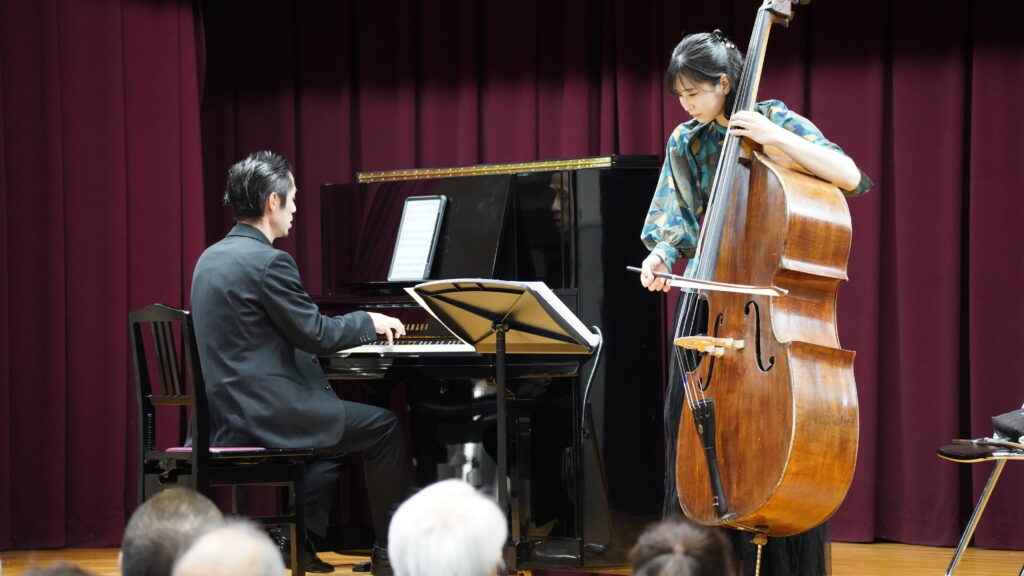 今回の演奏家は可児市出身のコントラバス奏者・長坂美玖さんと、本プロジェクトの参加は4回目となるアーラではおなじみのピアニスト・斎藤龍さん。
