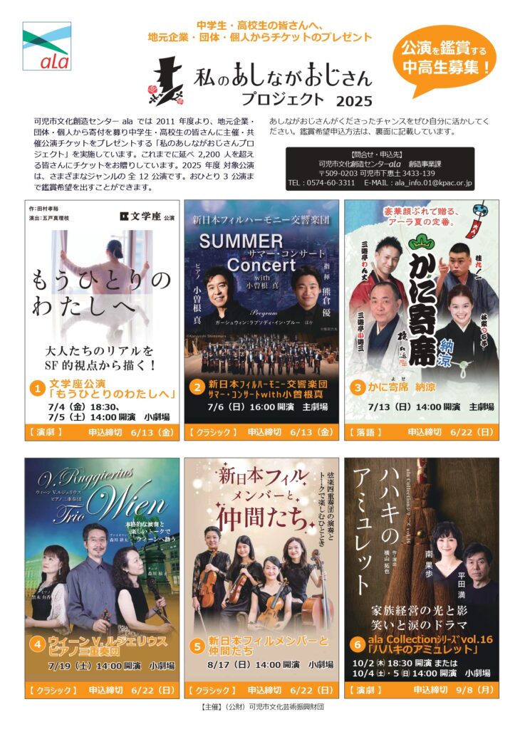 2011年度より地元企業・団体などから寄附をいただき、地域の中学生・高校生に公演チケットをプレゼントするプロジェクト。これまでに延べ2,200人の皆さんにチケットをお贈りしています。