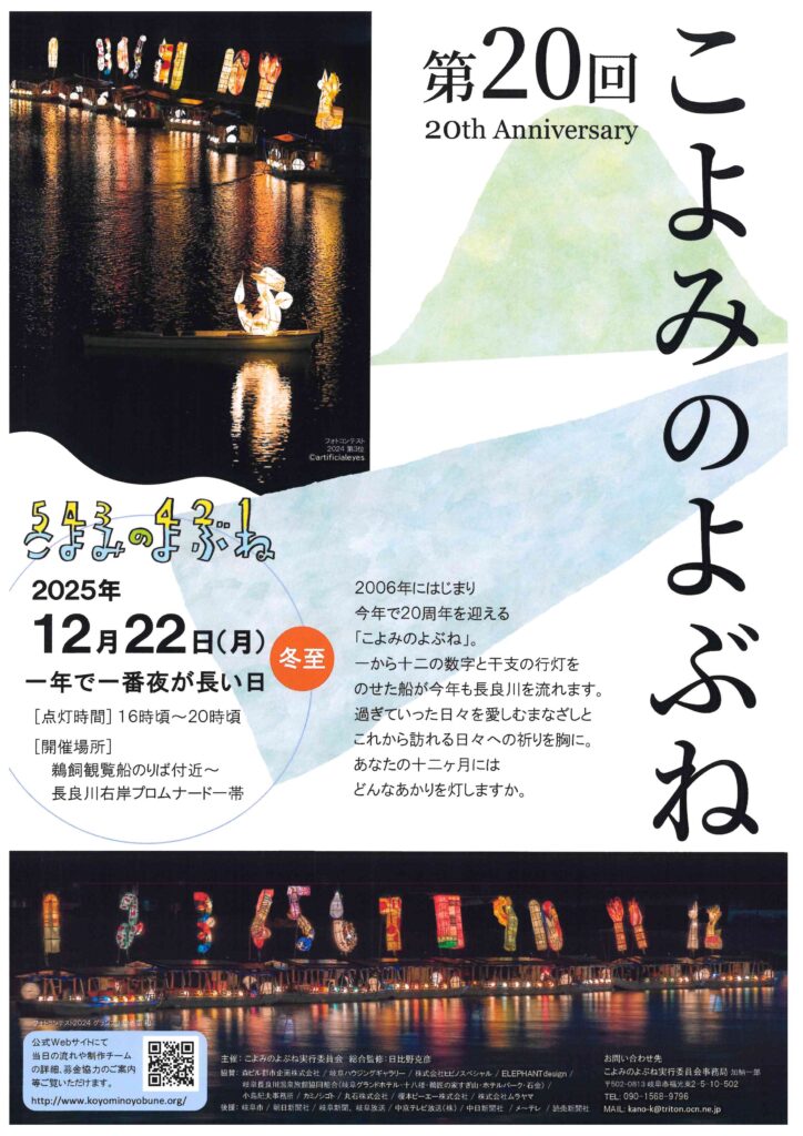 「こよみのよぶね」は、冬至の夜、岐阜・長良川に巨大な光のオブジェを浮かべる幻想的な行事です。千年以上の歴史を持つ美濃和紙や提灯など、岐阜の「あかり」の伝統文化を背景に、2006年に世界的アーティスト日比野克彦氏の提唱で始まりました。高さ5メートルの1から12の数字と干支の巨大行灯は、プロではなく、地域の市民グループが数ヶ月かけて制作。一つとして同じものがない13基のあかりが、市民の熱意と地域のアイデンティティを川面に映し出します。12/22冬至の日に、一年の区切りとしてこの岐阜ならではの冬の風物詩を長良川で楽しみください。