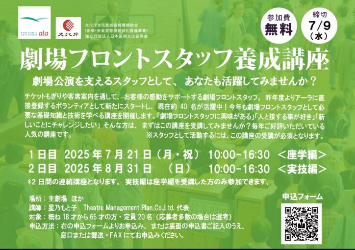 劇場公演を支えるスタッフとして、 あなたも活躍してみませんか? チケットもぎりや客席案内を通して、お客様の感動をサポートする劇場フロントスタッフ。昨年度よりアーラに直接するボランティアとして新たにスタートし、現在約40名が活躍中!今年も劇場フロントスタッフとして必要な基...