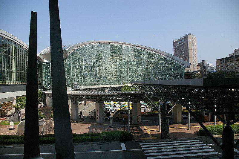 駅の東広場へ出ると、まずはガラスでできた「もてなしドーム」が出迎えてくれます。このドームは、金沢を訪れる人にさしかける雨傘をイメージしているのだとか。