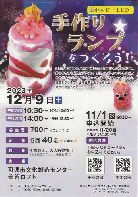 手作りランプをつくろう!! 2023年 2023年12月09日 ~ 2023年12月09日 今年もやりました。手作りランプをつくろう!! 2023年 沢山、応募して下さいまして、有難うございました。 今年は午前、午後の2回に分けて実施しました。沢山の参加有難うございました。 皆さん、楽しそうにランプを作っていました。 12月9日(土) 午前の部 10:30~(受付 10:00~) 午後の部 14:00~(受付 13:30~)