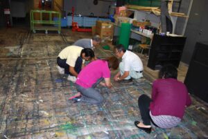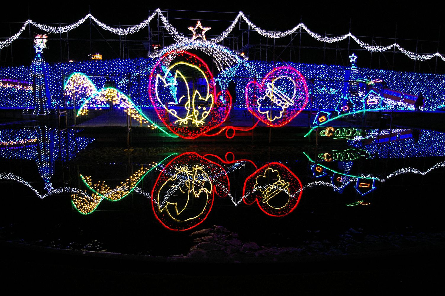 9月20日第1回イルミネーションプロジェクト会議が開催されました。出席者3人「えっこれだけ?」「3人で決めるの?」「仕方がない、今年は何を造りましょう」「テーマは?」「絵本は?」「絵本か…」ということで『絵本の世界』新美南吉生誕100年を記念して『手袋を買いに』がテーマです。まず、“狐の親子と手袋”“雪景色の中の町並み”に決まりました。「どんなイメージで造りましょうか」下絵を書いて図面に起こします。いよいよ制作開始、毎週水・木・金と3日間作業を行いました。11月9日13時よりイルミネーション据え付けが行われ、約2畳程のパネル4枚を4~5人掛かりで制作室から運び出しました。取り付ける足場は予め設置されていましたが、取り付け用の針金を付け足す。針金は太くて固く儘ならないが、伸ばしたりねじりあげたりして横一直線に張られた。「もう少し高く、もうちょっと右に寄せて」「この足場は絵の邪魔になるね。移動させよう」と図面を確認しながらの指示、ハンマーの響く音、金網を切ったり張ったりの作業が続き、終わった頃には日が傾いていました。冬の日差しは傾くのが早い。11月16日から来年の1月18日までalaの冬の夜空を飾ることでしょう。これから親子連れや子ども達がイルミネーションの絵本を見にalaを訪れてくれるのが楽しみです。