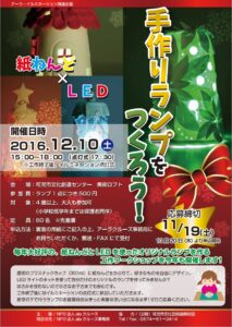昨年大好評だった、紙粘土とLED電球を使ってオリジナルランプを作るワークショップ『手作りランプをつくろう』が今年も12月10日に開催されました。締め切り前に定員いっぱいになり、65組100人の参加者が楽しみながら製作しました。受付時にキットを受け取りスタッフの説明の後、早速作り始めました。透明のプラスチックカップにLEDライトのキットを使って紙ねんどをかぶせて好きなものを自由にデザイン、色づけして完成。イルミネーションの点灯式に合わせ各自点灯。子ども達の歓声がalaに響き渡っていました。作品は持ち帰り、各家庭で光輝いたことでしょう。子ども達の喜んだ顔を見て、スタッフもやりがいを感じたことと思います。やってよかったと!