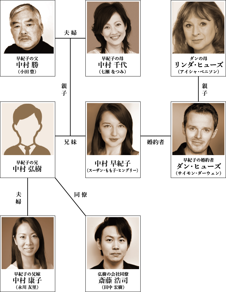 岐阜県可児市、中村家に、ロンドンで暮らす娘・早紀子が、婚約者・ダンとその母・リンダを伴い帰ってくる。母・千代が迎え入れ、しばし流れる、和やかな異文化交流の時間。だが早紀子は様変わりした自室や、娘の帰省を知りつつ不在を決め込む父・勝に不信感を募らせ、「“違う生き方”を選んだことで、自分は今も両親に罰せられているのだ」と鬱積した想いをダンに吐露する。やがて、早紀子の兄・弘樹の見舞いと称して、彼の同僚が来訪する。名古屋で妻と暮らすはずの兄。次第に、知られざる家族の姿が浮き彫りにされていく――。